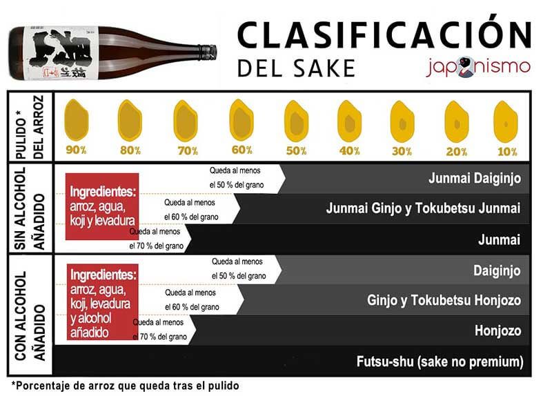 Y es este hecho el que marca el precio final del producto, ya que cuanto más se pule el arroz, más se desperdicia y más caro cuesta. En el gráfico puedes ver las diferentes categorías de sake según el pulido de arroz y el añadido o no de alcohol.